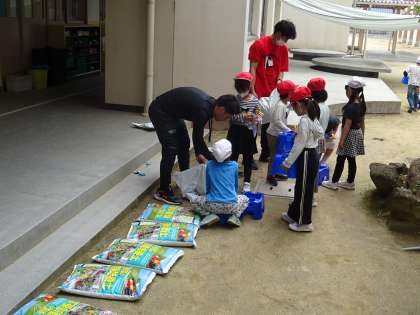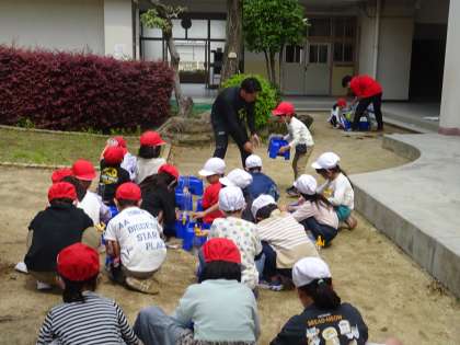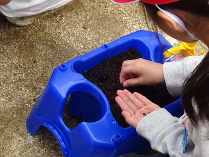 先生にプランターに土を入れてもらい、指で穴をあけ、あさがおのたねを入れました。