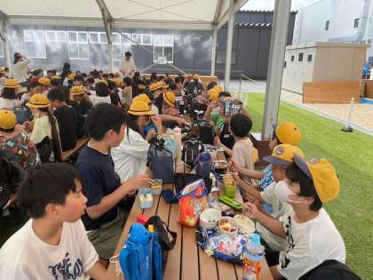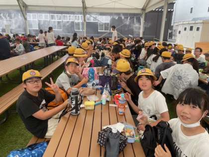 6年生も万博会場に着いています。熱気あふれる万博の雰囲気にワクワクしている様子です。早めの昼食ですが、いつもより朝が早くお腹が空いていたようでおいしそうに昼食を食べています。