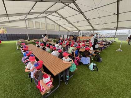3年生も万博会場に到着しました。みんなでお昼ご飯を食べています。この後、噴水ショーを見に行く予定です。