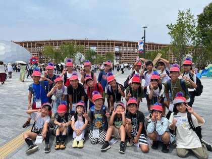 4年生も入場しました。人が多くて近くまでは行けませんでしたが、ミャクミャクと記念撮影しました。(写真の左端にミャクミャクがいます)