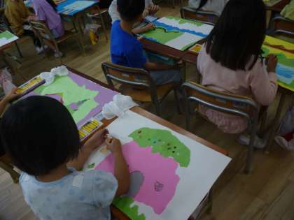画用紙に、ちぎった紙を自由にのりではりつけました。その形から何に見えるか考え、クレヨンで仕上げていきました。