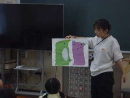 「箱に見え、リボンをつけプレゼントの作品にしました」「とがっているのが耳に見え、ペンギンとリスの絵にしました」教室から大きな拍手がありました。