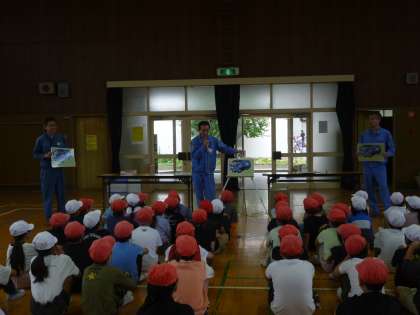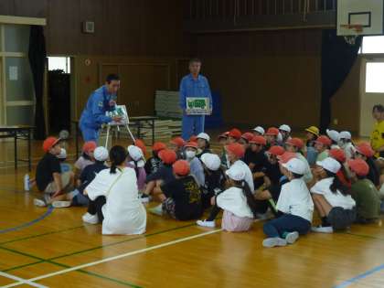 講堂では、分別とリサイクルについてクイズ形式で学びました。ユーモアたっぷりのお話で最後までみんなニコニコ顔でした。