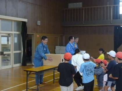 ダンボール箱を使った空気砲では、どのくらいの風の強さがあるのか実際に体験しました。担任の先生2人が最後に体験した時はとても盛り上がり、お土産にペットボトルから作られた定規をいただき楽しく有意義な体験でした。