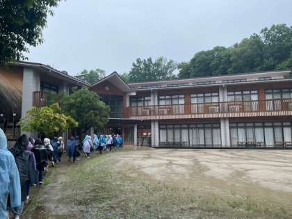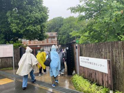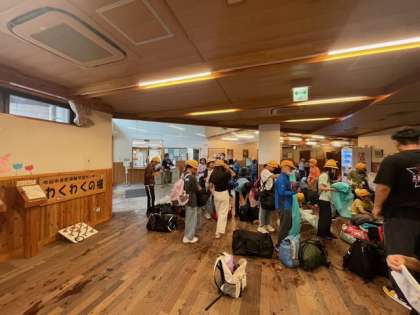 少し雨が降っていますが、みんな無事にわくわくの郷に着きました。
