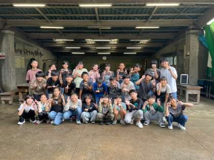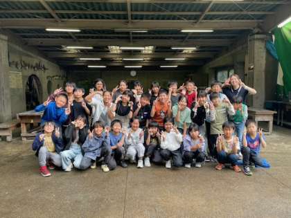 勾玉を首飾りにして、クラスでの集合写真です。みんな笑顔です。