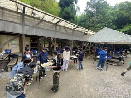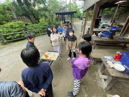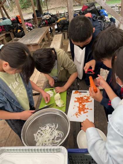 クイズラリーをしながらの自然観察も終わり、今は焼きそば作りを頑張っています。
