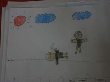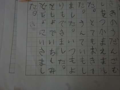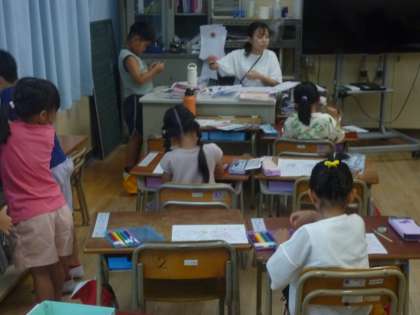 昨日のできごとを絵日記に仕上げました。習ったひらがなを使って「プールでじゃんけんした」「かみなりがなってこわかった」「おみせでおかしをかった」などかわいい文章が並んでいました。その様子を絵にかき色鉛筆で色塗りをし、カラフルな絵になりました。