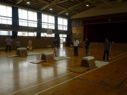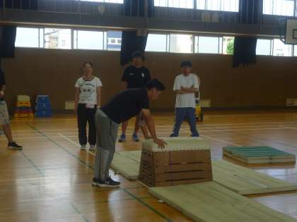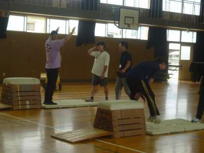 まず、講堂でマットの指導の仕方を学びました。基本的な身だしなみやマット・跳び箱・踏切板の出し入れの仕方、跳ぶときの手のつき方など実際に活動し、今後の授業に生かすことができる研修会でした。