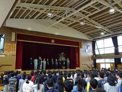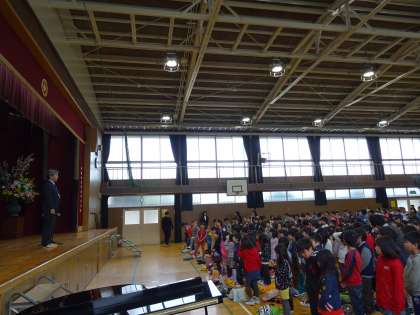 着任式では、新しく転任してこられた教職員の紹介を受け、子どもたちは「よろしくお願いします!」と大きな声で新しく来られた方を迎えていました。新しい教職員の方に、みんな興味津々です。