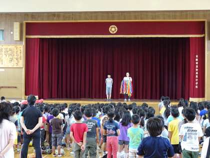 朝会の時に6年生の代表児童が、今まで協力してもらったお礼の言葉といっしょに千羽鶴を披露しました。全校児童の協力もあって、なんと2つの千羽鶴ができました。