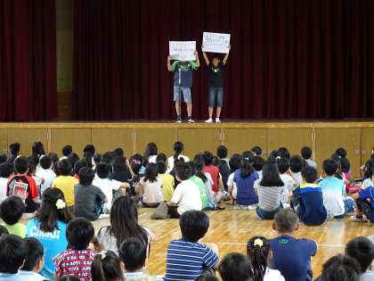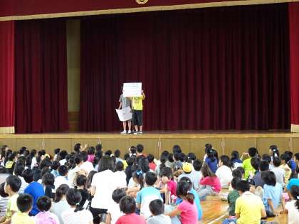 今日の児童集会では、保健美化委員の児童によるクイズがおこなわれました。