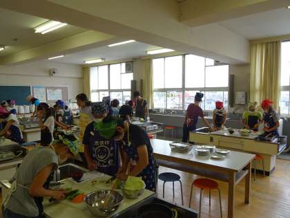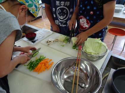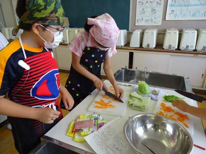手際よく野菜を切り、協力して調理することができました。どの班でも「おいしくできた!」という声が聞かれ、子ども達のたくさんの笑顔が見られました。