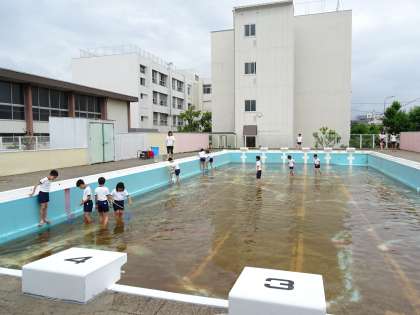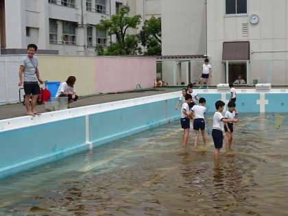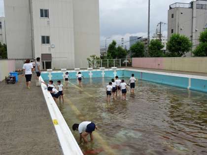 プールにはたくさんの「やご」や「アメンボ」がいます。毎年プール清掃をする前に飼育栽培員会の児童がやごとりをしています。今日もたくさんのやごがとれたようです。