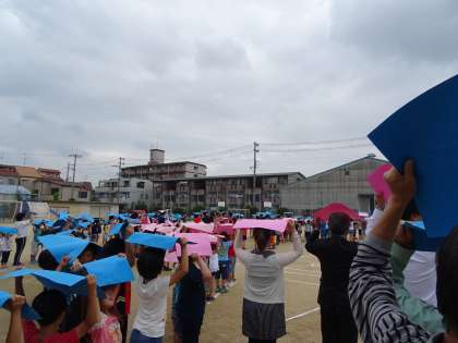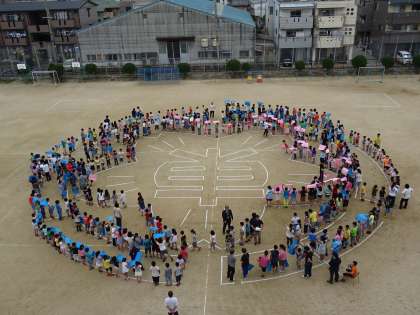 加美東小学校創立40周年を記念して、航空写真撮影がおこなわれ、全校児童と教職員が画用紙を持って、撮影に取り組みました。