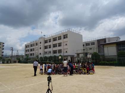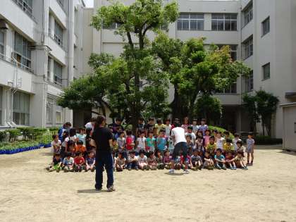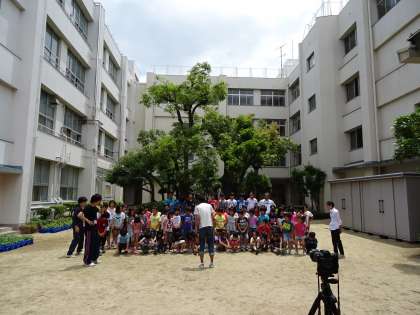 航空写真、全体写真が終わったあと、各学年にわかれての学年写真撮影がおこなわれました。写真は1〜3年生の撮影時の様子です。