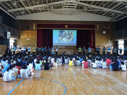 子ども達に向けた平和と愛のメッセージとして、加美東小学校の教職員で歌と呼びかけを朝会時におこないました。「イマジン」の曲をピアノ・ギター・サックス・フルートで演奏し、メッセージをこめた歌詞を歌いました。