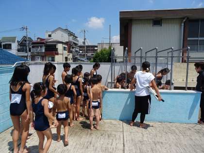 交流プールでは、宝探しゲームやおんぶレース、じゃんけん列車などをして、みんなで楽しく活動をしました。1年生に優しく接する6年生の姿がたくさん見られ、1年生の子ども達は安心してプールに入っていました。