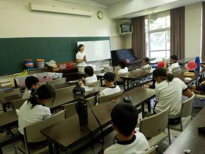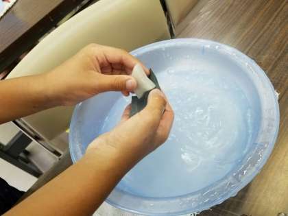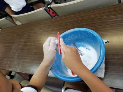 勾玉体験で、一生懸命石を削っていろいろな形を作っいます。