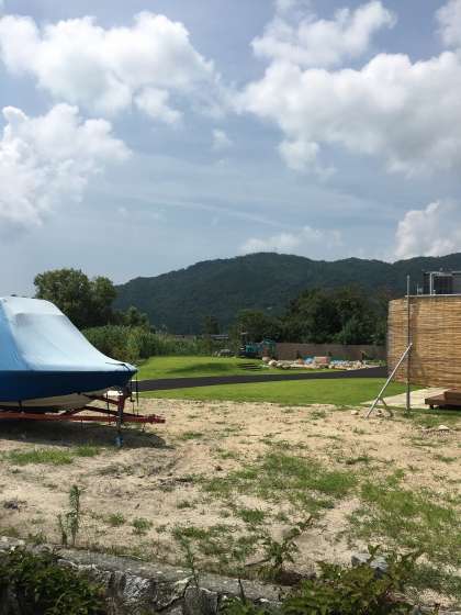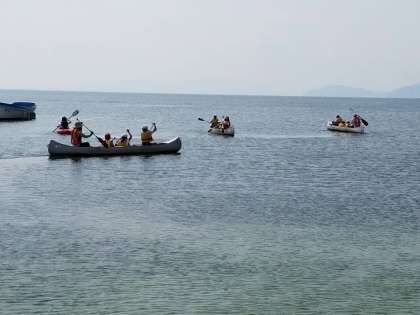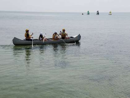 班に分かれて、カヌーとザリガニ釣りを体験しています。