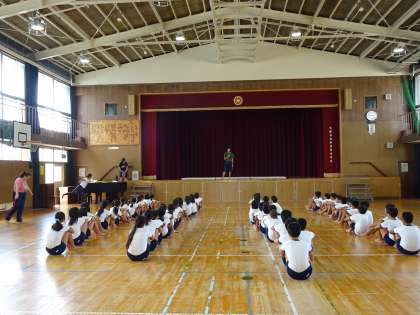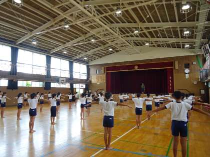 5年生と6年生では、今日から組体操の練習が始まりました。練習前には、先生のしっかりと聞き、「絶対に成功させるぞ!」と気持ちを高めている様子が伺えました。