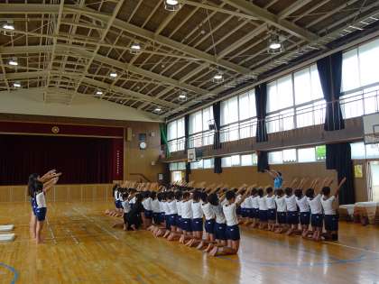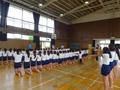 6年生の組体操の練習の様子です。今日は、ウェーブの練習をしました。手をあげたりさげたりの動きを全員でそろえ、手をつないだウェーブも息を合わせてすることができていました。