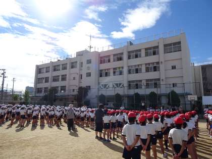 2回目の全体練習がおこなわれ、1回目のときよりも上手に並んで行進したり、元気よく校歌を歌ったりするなど、暑い中でしたが、みんながんばって練習に取り組んでいました。