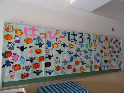 1年生の教室の横の掲示板には、「はっぴーはろうぃん」と題して、1年生の子ども達が作った作品が掲示されています。子ども達は一生懸命作品作りに励んでいました。