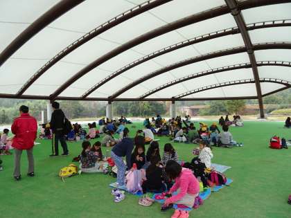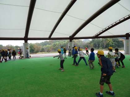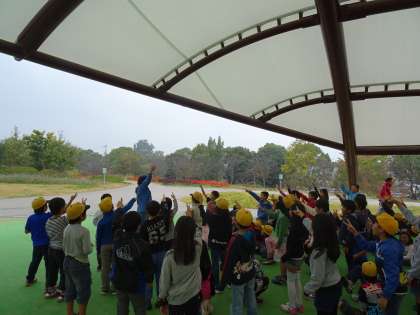 目的地に着くと同時に雨が降ってきて、残念ながら公園内の遊具で遊ぶことはできませんでした。しかし、屋根のある広場で子ども達はだるまさんがころんだをしたり、全員でじゃんけんゲームや○×クイズ大会をしたりして、とても楽しんでいました。