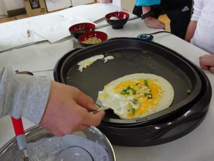 シャンリィクィの活動で、ジェンビングォズ(中国風クレープ)を作りました。中国の屋台でよく売られているそうで、日本円にして、100円くらいのものらしいです。