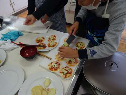 今日の調理実習では、ジャーマンポテトとミニポテトピザを作りました。味付けもピザの焼き加減も上手にできたようで、美味しく食べていました。