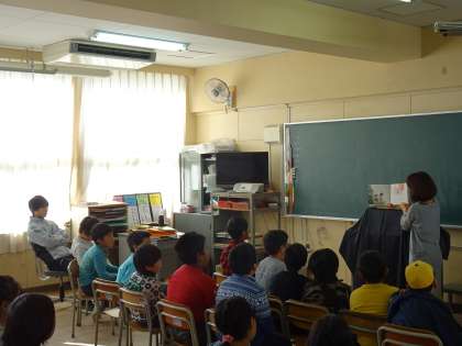 平野図書館の方に来校していただき、4年生は本の読み聞かせをしてもらいました。