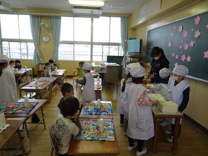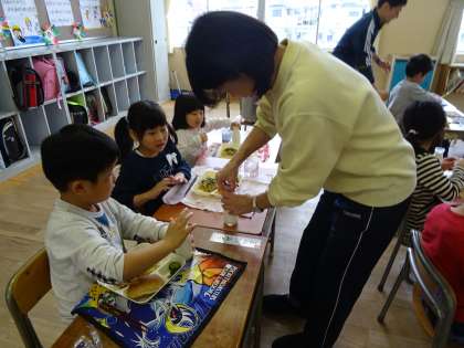 なかなかうまく牛乳キャップの開けれない子もいましたが、自分一人の力でがんばって開けようとする姿が見られました。