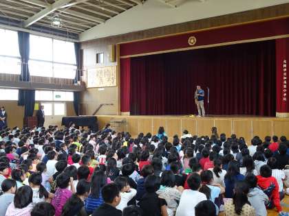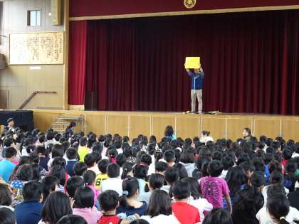 今日の朝会では、子ども達に鑑賞マナーを身につけるため、先生が楽器を演奏し鑑賞マナーについて教えてくれました。