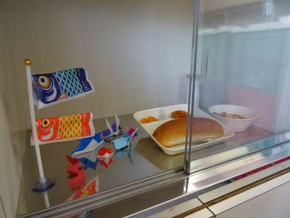 さらにそこには給食調理員さんが仕事の合間をぬって作ってくだった飾りも置いてあります。子ども達は気持ちのこもった手作りの飾りを見て、あたたかい気持ちになっているようです。今日も元気に「いただきます!」と大きな声で給食を取りに来ていました。