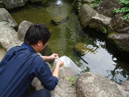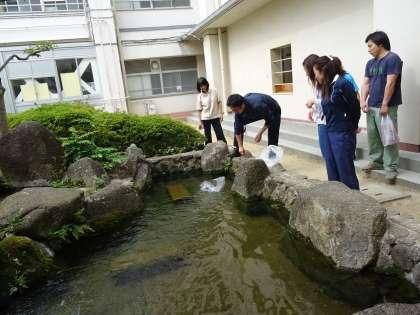 教職員のみなさんが見守る中、小さな鯉が池に入れられました。