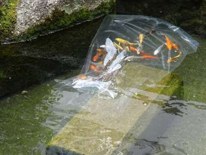 加美東小学校の中庭にある池に、あらたに鯉が20匹ほど加わりました。