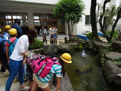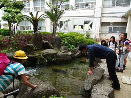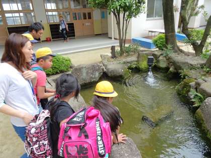 鯉を池に入れるとすぐに子ども達も池のそばに来て鯉を見ていました。