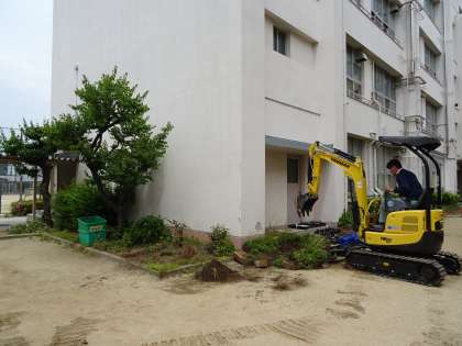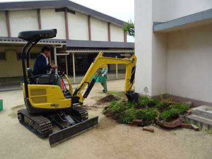 今日から中庭の花壇の工事がはじまりました。これまでの花壇を取り壊し、新しい花壇を作るために重機での作業がおこなわれています。