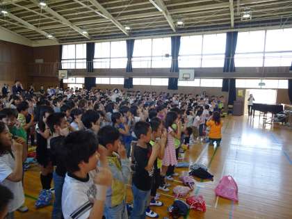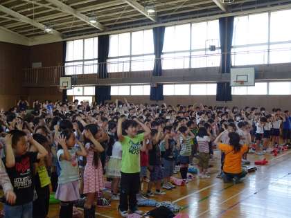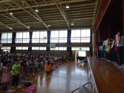 だんだん曲のスピード速くなって難易度があがっていきましたが、みんな曲に合わせようとがんばっていました。とても楽しい雰囲気で英語朝会をすることができました。