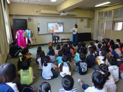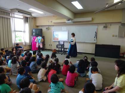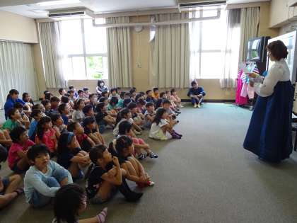 韓国・朝鮮の絵本の読み聞かせをしてもらうと、子ども達は静かにお話を聞いて学習を深めていました。