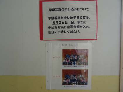 各学級前に掲示してある学級写真ですが、写真購入を希望の方で、まだ申し込み用紙を提出しておられない方は、明日(26日)までとなっていますのでよろしくお願いします。
