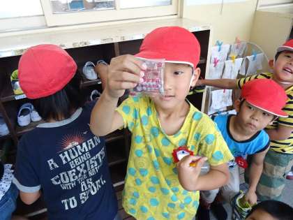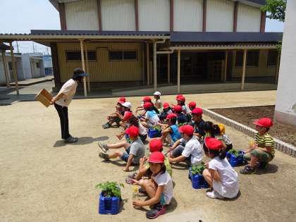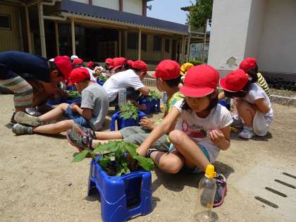 あさがおが大きく育つようにと、子ども達はこやしを一つずつ丁寧に置いていました。