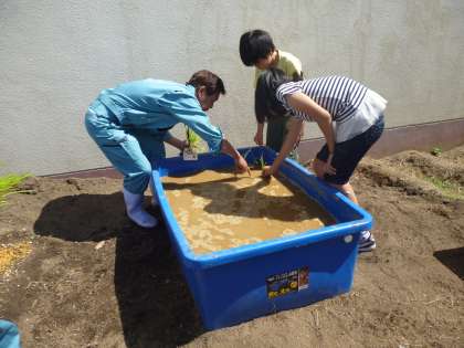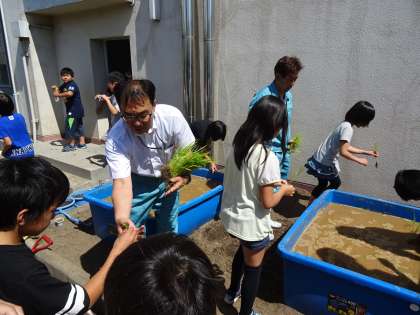 JAの方に来ていただき、田植えについていろんなことを教えてもらったあと、学習園に行って田植え体験をしました。