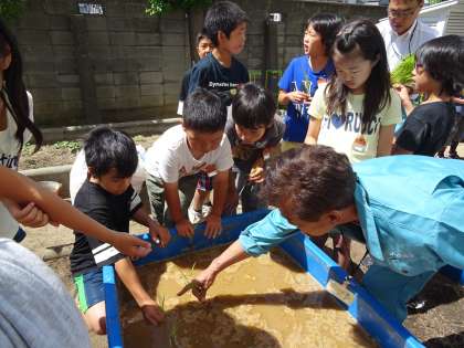 JAの方から稲をもらい、一人ずつ植えていきました。田んぼの感触を味わいながら、子ども達は楽しそうに田植えをしていました。