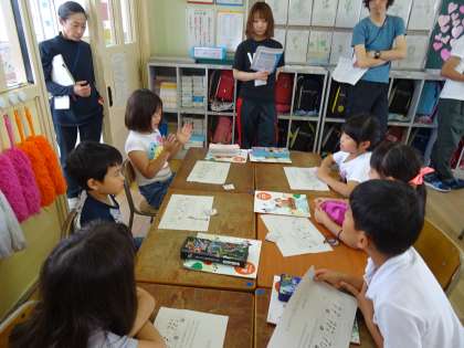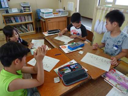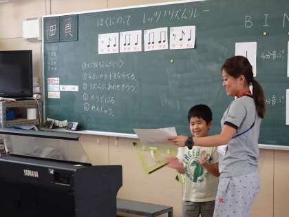 できたリズムをみんなの前で発表し、友だちのつくったリズムをみんなで手拍子したり、よかったところなどを話し合いました。