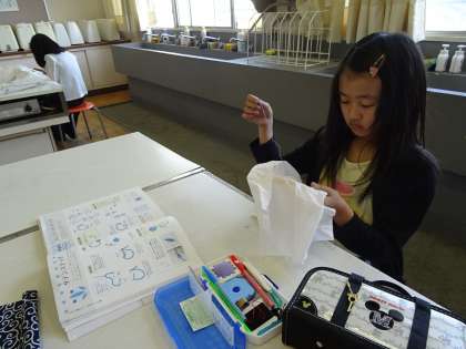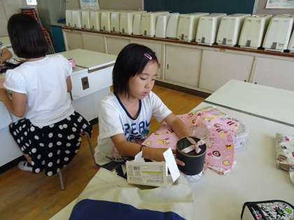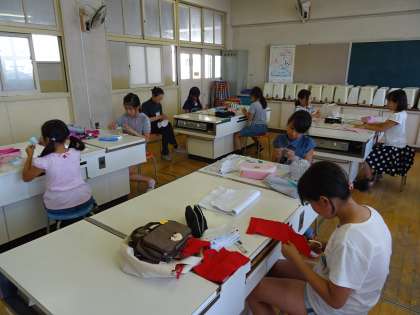 裁縫道具を使っての作業に子ども達はとても集中して活動していました。4年生の子ども達も布を上手に切ったり縫ったりして、手際よく作業を進めていました。
