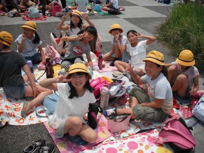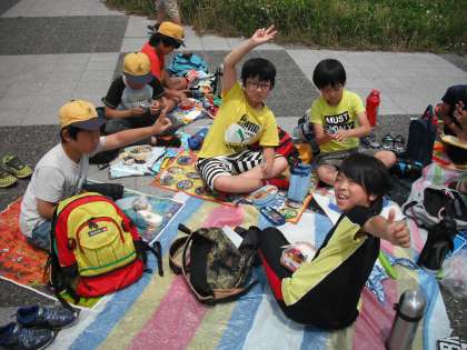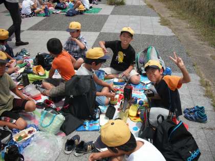 河川敷でみんな楽しくお弁当を食べました。