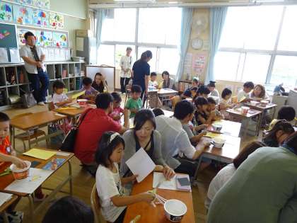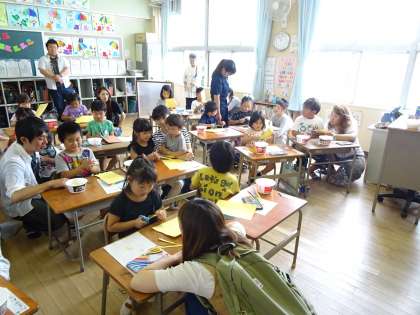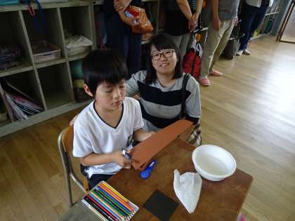 図工の学習では、保護者の方にも手伝ってもらいながら子ども達は楽しく作品作りをしていました。