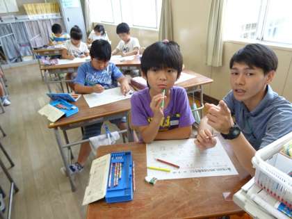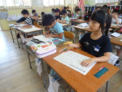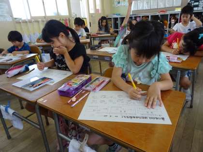 子ども達はワークシートに書かれた食べ物を一生懸命考えながら色分けしていました。